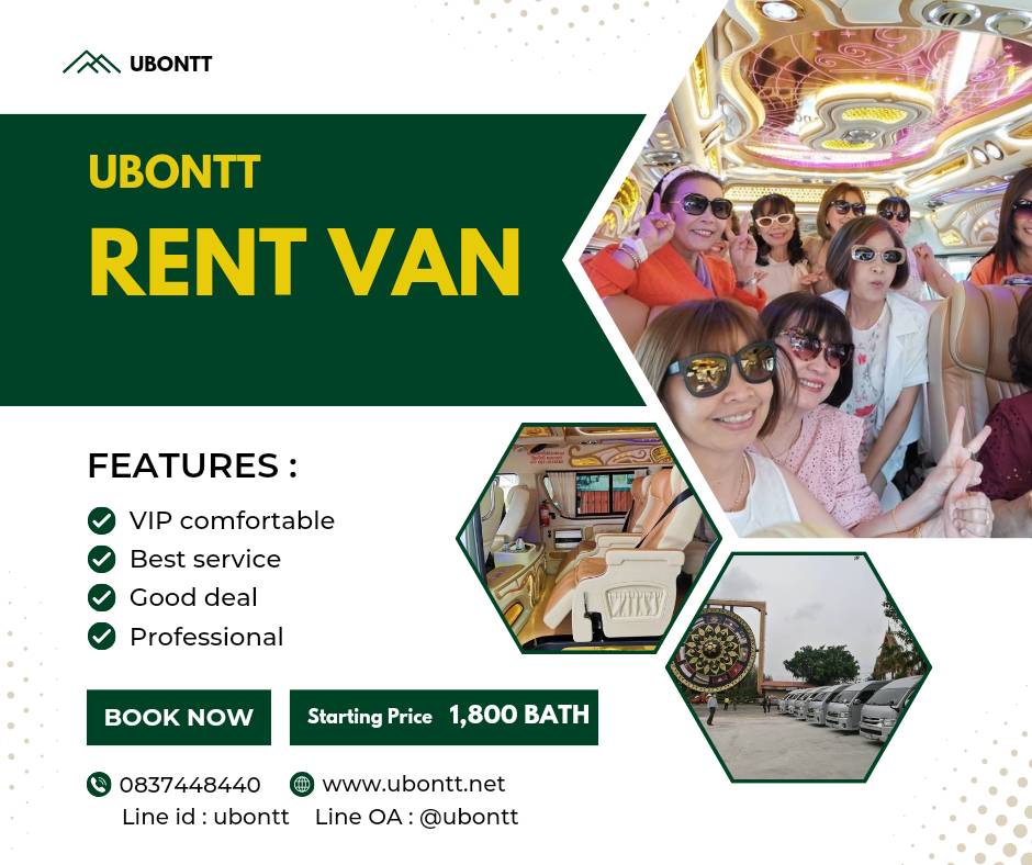 • อุบลทีที ให้บริการ เช่ารถตู้ VIP พร้อมคนขับมืออาชีพ เชื่อถือได้ สำหรับเที่ยวในจังหวัดอุบลราชธานี และท่องเที่ยว ลาวใต้ รองรับทั้งกลุ่มเล็ก-ใหญ่ มีรถหรูสะดวกสบาย ราคาเริ่มต้นที่ 1,800 บาท/วัน (ไม่รวมน้ำมัน) พร้อมบริการรับ-ส่งสนามบิน อุ่นใจทุกเส้นทาง