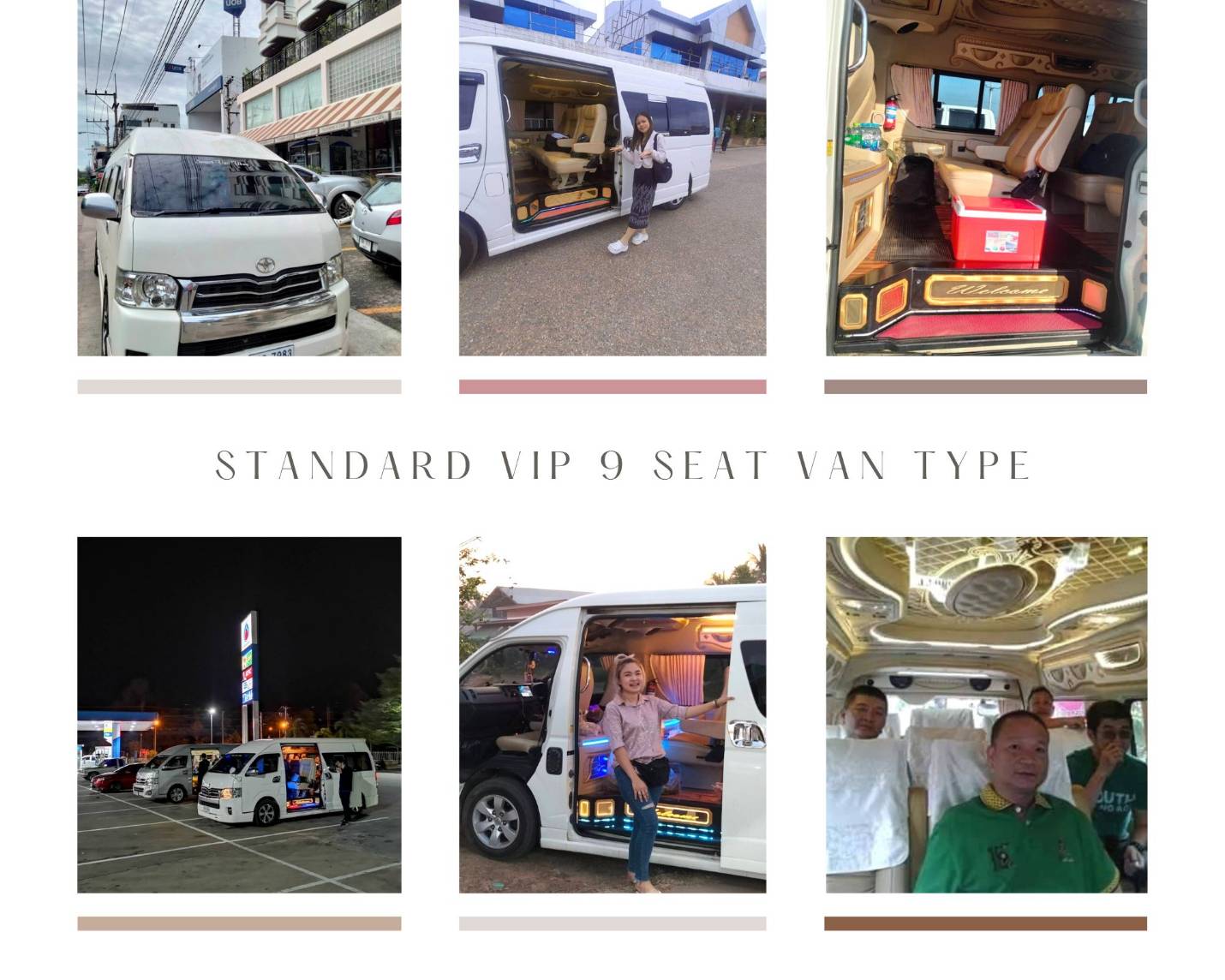 • รถตู้ที่นำมาให้บริการ มีรถตู้ให้เช่าจำนวน 4 รุ่น ได้แก่ รถตู้เช่ารุ่น Toyota commuter เครื่องยนต์ ดีเซล ขนาด 2,500 - 3,000 cc. ตกแต่งภายในแบบวีไอพี เบาะขนาดใหญ่นุ่งสบาย ขนาด 8-9 ที่นั่ง มีเครื่องอำนวยความสะดวกไว้ให้บริการลูกค้า เช่น ที่ชาร์จโทรศัพท์แบบ USB และแบบเต้าเสียบไฟฟ้า บริการทุกที่นั่ง มีเครื่องเสียง ทีวี และระบบ wifi บริการฟรี
