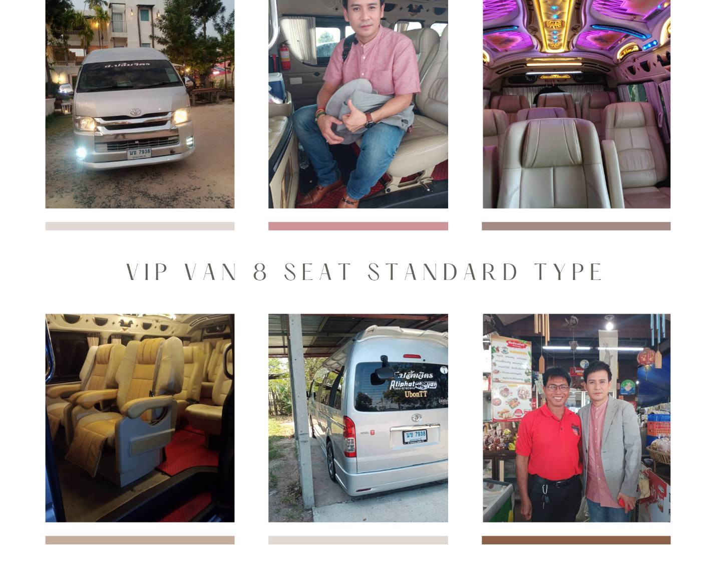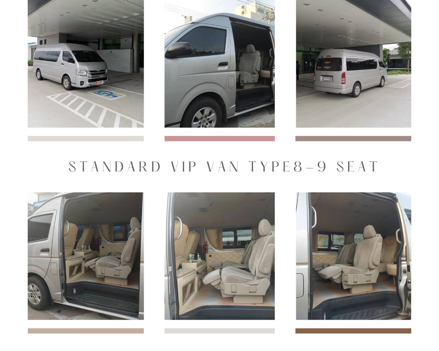 • แบบที่ 1 รถตู้เช่าวีไอพี ขนาด 8 ที่นั่ง เบาะด้านหลังคนขับจะเป็นเบาะแยกกัน เป็นแบบเก้าอี้มีพนักพิงขา นั่งสบายมีเข็มขัดนิรภัยทุกที่นั่ง